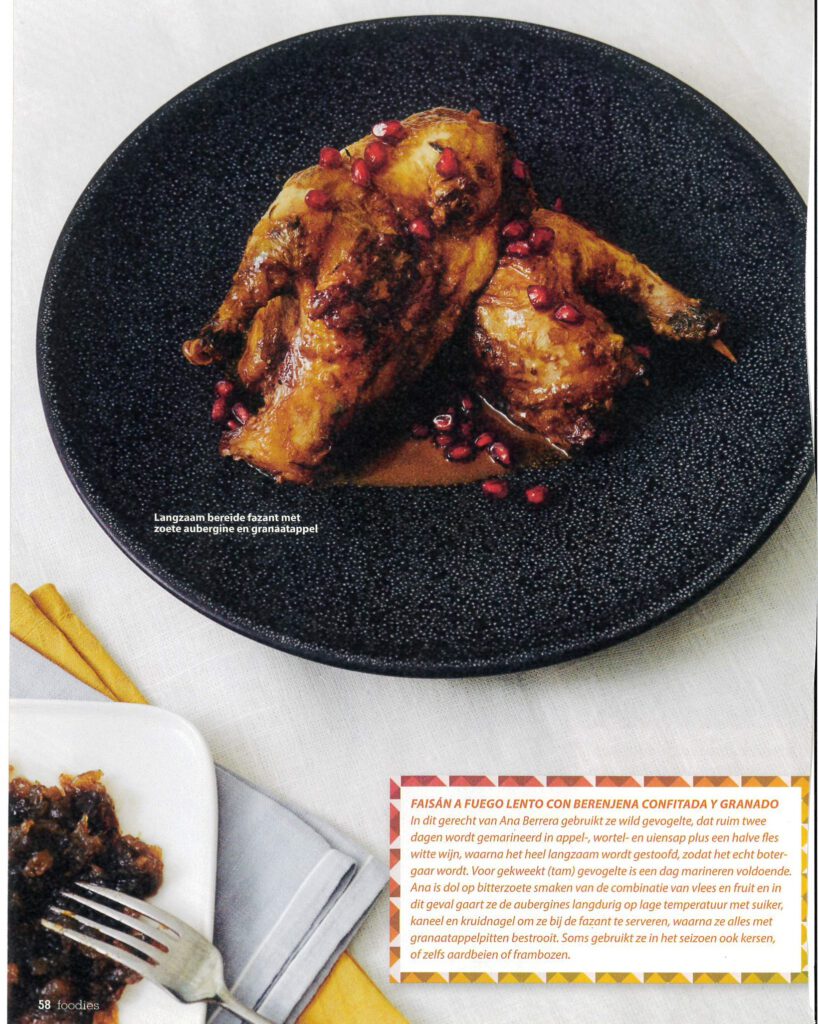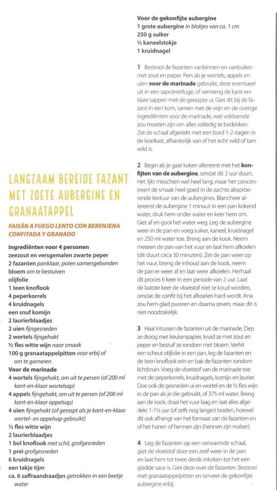 Langzaam bereide fazant met zoete aubergine en granaatappel