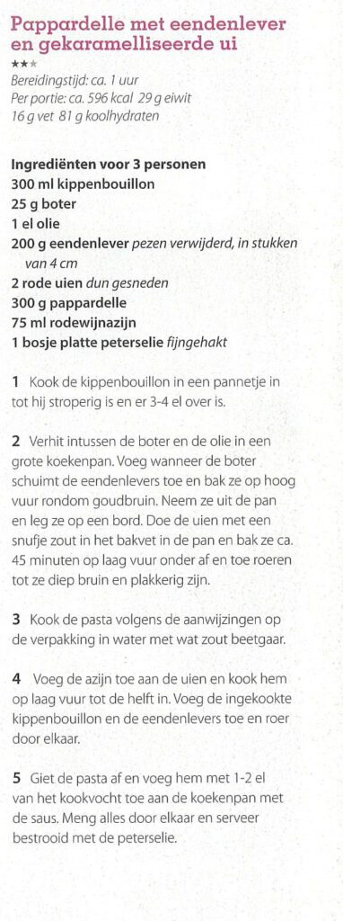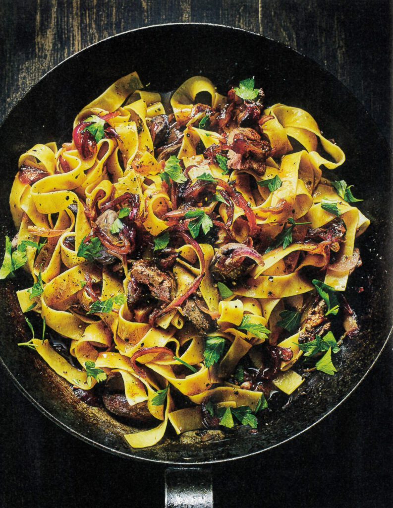 Pappardelle met eendenlever en gekaramelliseerde ui